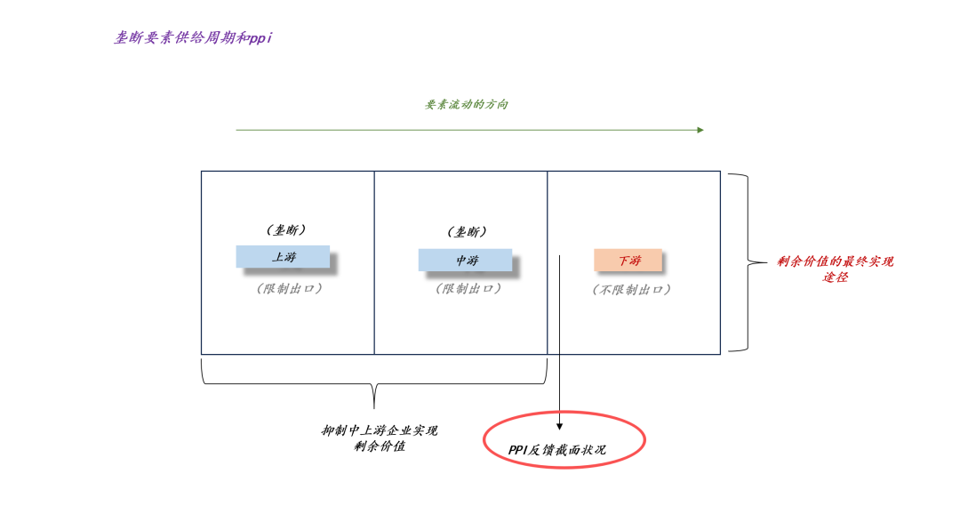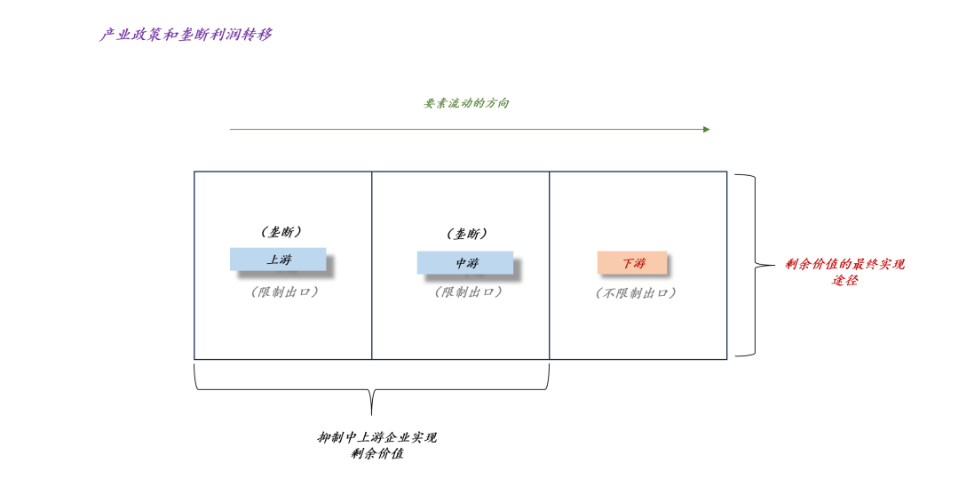 如上图所示,政府可以抑制中上游企业实现剩余价值:1、限制初级产品的出口;2、限制初级产品的垄断利润率。于是,大量的剩余价值无法在上游实现,被迫流转到下游,最后,通过出口的方式来实现垄断利润。