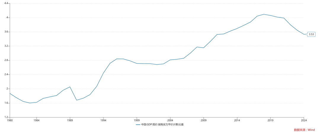 我们可以拿中国当年的名义GDP除以世界银行所公布的购买力平价GDP来计算购买力平价人民币汇率,如上图所示,2024年购买力平价人民币汇率在3.53 。