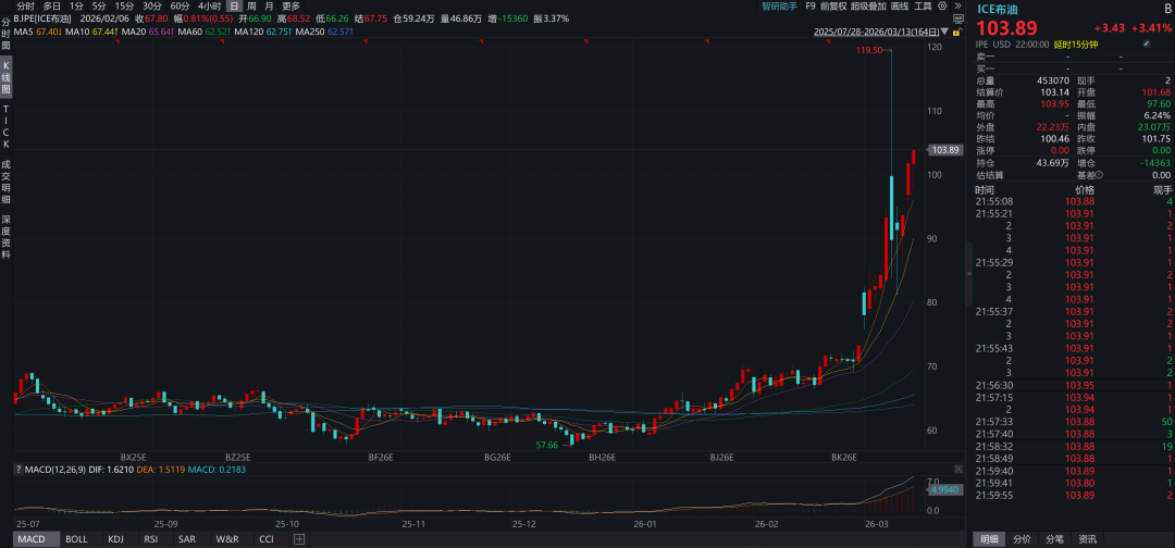 如上图所示,原油属于初级物资,随着中东局势的持续紧张,原油价格大幅上涨,布油价格已经攀升至103美元附近。这带来了两个自然后果: