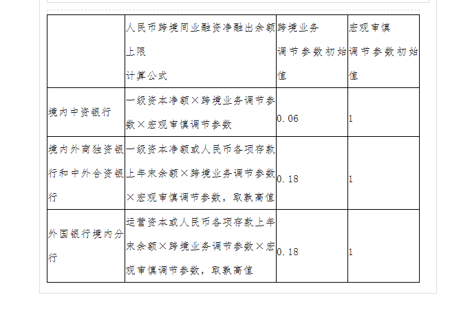 十、中国人民银行综合考虑人民币离岸市场发展、跨境资本流动形势、境内银行展业情况等因素,可适时调整跨境业务调节参数、宏观审慎调节参数以及人民币跨境同业融资净融出余额计算方式,参数调整可针对部分或全部银行进行。