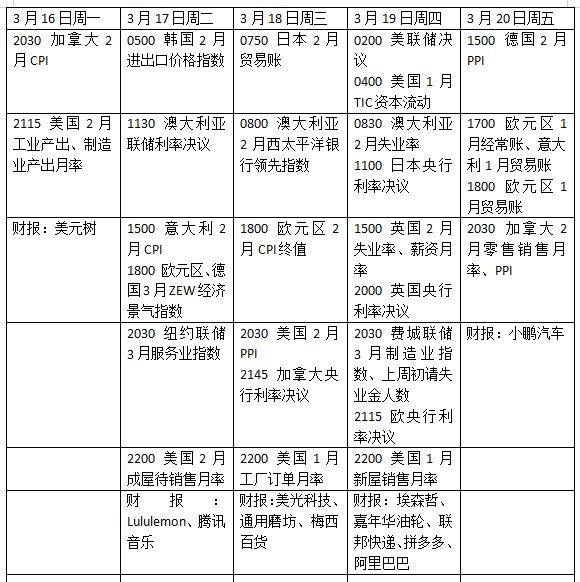 下周一至周四,英伟达年度全球技术大会(GTC)将召开,英伟达CEO黄仁勋预计将发布多项与 AI 相关的重磅消息,或对科技股产生显著影响。此外,未来一周美光科技、通用磨坊、联邦快递、美元树、Lululemon和嘉年华邮轮等,中概股阿里巴巴、拼多多等将公布季度财报。